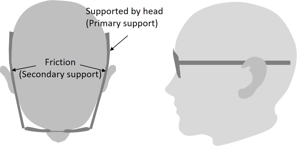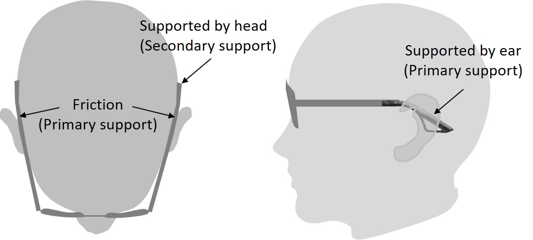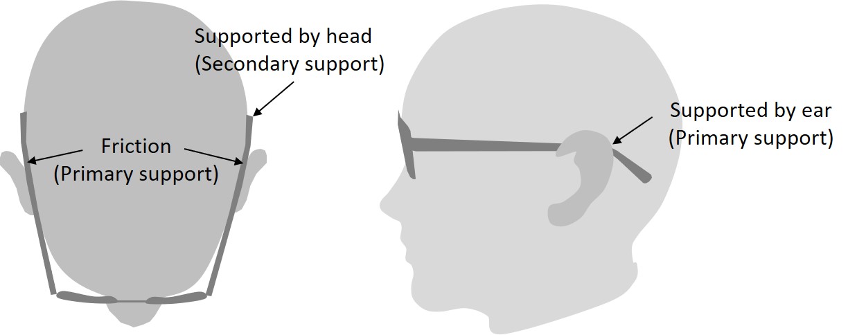 Most conventional frame uses friction as the primary support to hold the glasses on the face. Friction comes from the contact points at the temple and nosepad. Friction from the nosepad is effective when the face does not tilt down substantially. As the face tilts down, the weight of the lens gets shifted away from the nosepad and the friction reduces. Much of the holding force now depends on the temple. There are three areas of force application for the temple to hold the glasses. The first is support from friction between the temple and the side of the head. The other two are mechanical support by the ears and by the head. Most temple tip designs will have at least one primary support. They may also have secondary supports which are much weaker but still contributes to holding the glasses in place.