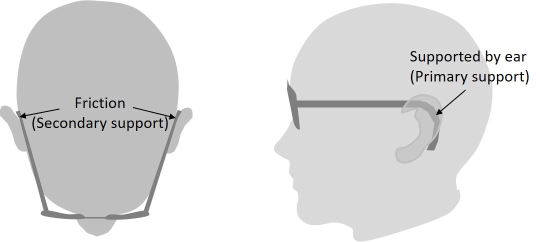 The cable or curly temple is probably the most secure design with the curved temple tip to hook down the back of the ears. The weight of the glasses is supported mainly by the back of the ears with some contribution by friction as shown in figure 4. Unfortunately, this design is unpopular as it may cause discomfort to the user if the temple tip squeezes the ear. It is also not possible to make any adjustments to the curvature of the temple tip.