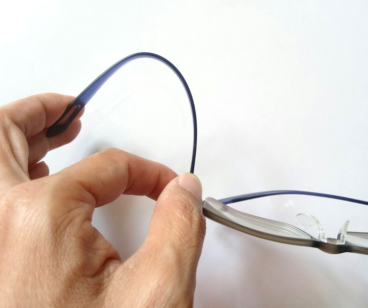 Its flexibility and ability to bend without breaking is good. However, when the temple stiffness is too low, this will reduce its wearability. The temple of an eyeglasses frame needs to have a minimum stiffness in order to provide sufficient force to grip onto the side of your head. Without sufficient stiffness, the glasses will certainly slip when you bend your head down. On the other hand, if the stiffness is too high, it will put too much pressure on the head.