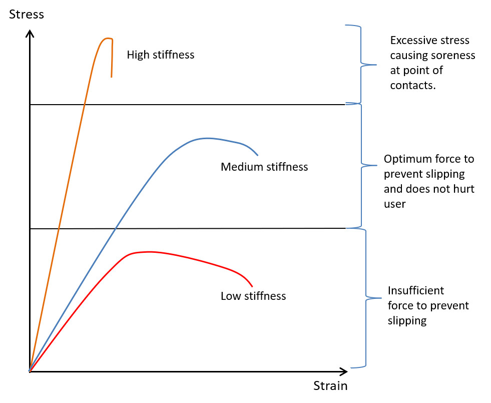 Stiffness of the temple depends on the material property and its cross-sectional shape. In the simplest sense, a thicker temple will have a greater stiffness than a thin temple. Ultem and TR-90 both have good strength and flexibility but the cross-section of the temple need to be designed in such a way that it provides sufficient stiffness for normal usage.